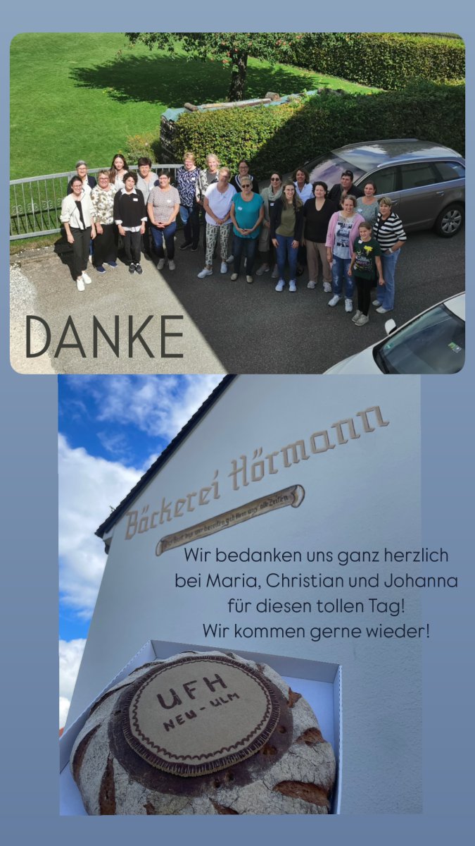 Am Sonntag, 14.09.2025 um 11 Uhr treffen sich die UFH-Frauen (und ausnahmsweise auch Männer) zu einem gemeinsamen Frühschoppen bei Maria Prinz und Familie in der Bäckerei Hörmann Klosterbäck in Roggenburg. Außerdem dürfen wir selber Brezeln backen und haben die Möglichkeit, uns an der Brotmalerei auszuprobieren.